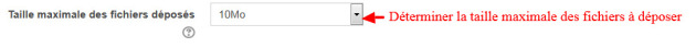 l'enseignant peut déterminer la taille maximale des fichiers pouvant être déposés dans le cours, cette taille ne peut pas dépasser celle définie par l'administrateur de la plate-forme. Chaque activité comprend également un tel réglage permettant à l'enseignant de fixer des valeurs particulières pour les fichiers déposés dans ces activités.